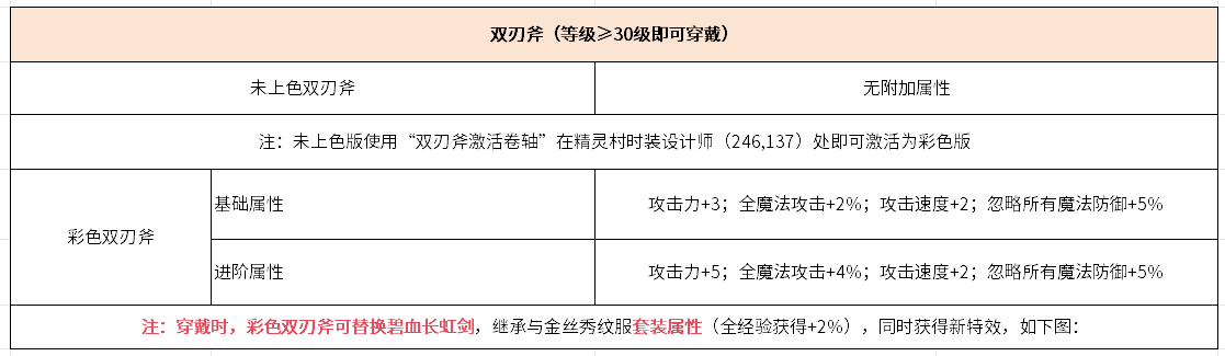 双刃斧激活卷轴:在精灵村时装设计师(246,137)处可将“未上色双刃斧”激活为“彩色双刃斧”,转换后未上色的双刃斧和双刃斧激活卷轴会消失。